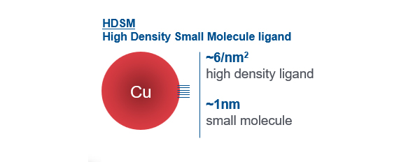 独自のHDSM(High Density Small Molecule)表面処理により、ナノ粒子表面に高密度(約6分子/nm²)のリガンド層を形成します。この表面設計は粒子間相互作用の精密な制御を可能にし、優れた分散安定性を確保するとともに、制御された自己組織化を実現します。