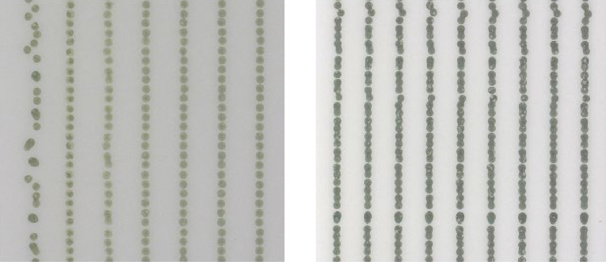 下の写真は、制御条件の違いによる吐出状態の差異を示しています。どちらのパターンも理想からは外れているものの 、右側のパターンの方がAIにとってモデル化と補正しやすいため、最終的な精度を大幅に向上させることができます 。
