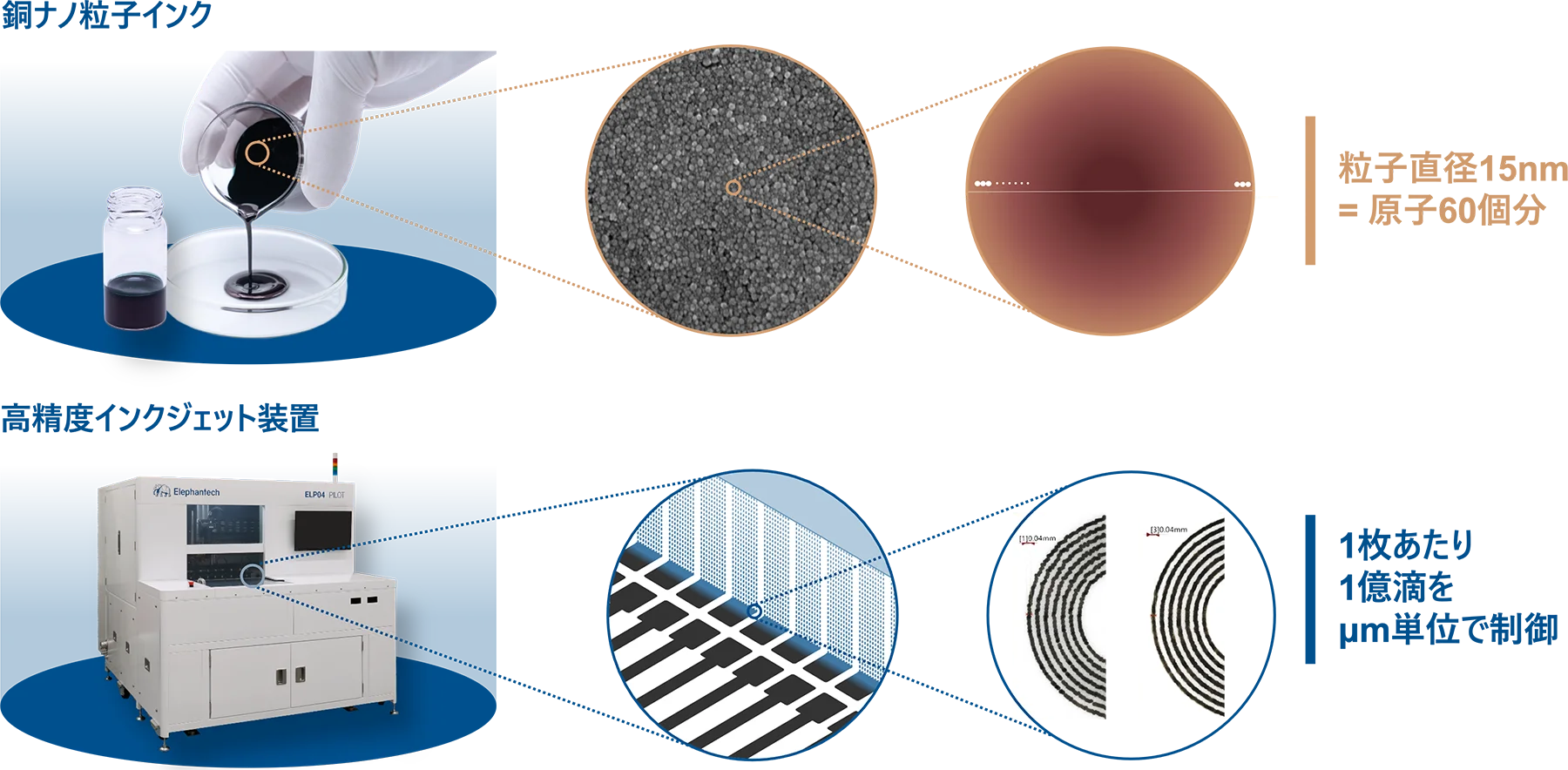 ELP04の最大の強みは、インクジェット吐出制御、機械制御、数理最適化アルゴリズムなどを統合した、エレファンテック独自の垂直統合型技術スタックにあります。 直径わずか60原子分・粒径15nmクラスという世界最高水準の銅ナノマテリアルを用いたインク処方から、1枚のパネル上で1億個のインク滴を高精度に制御するシステムまでを包括的に設計。材料・メカ・制御システムの各領域をすり合わせることで、インクジェットの性能を極限まで引き出し、最大限のシナジーを生み出しています。技術の垂直統合
