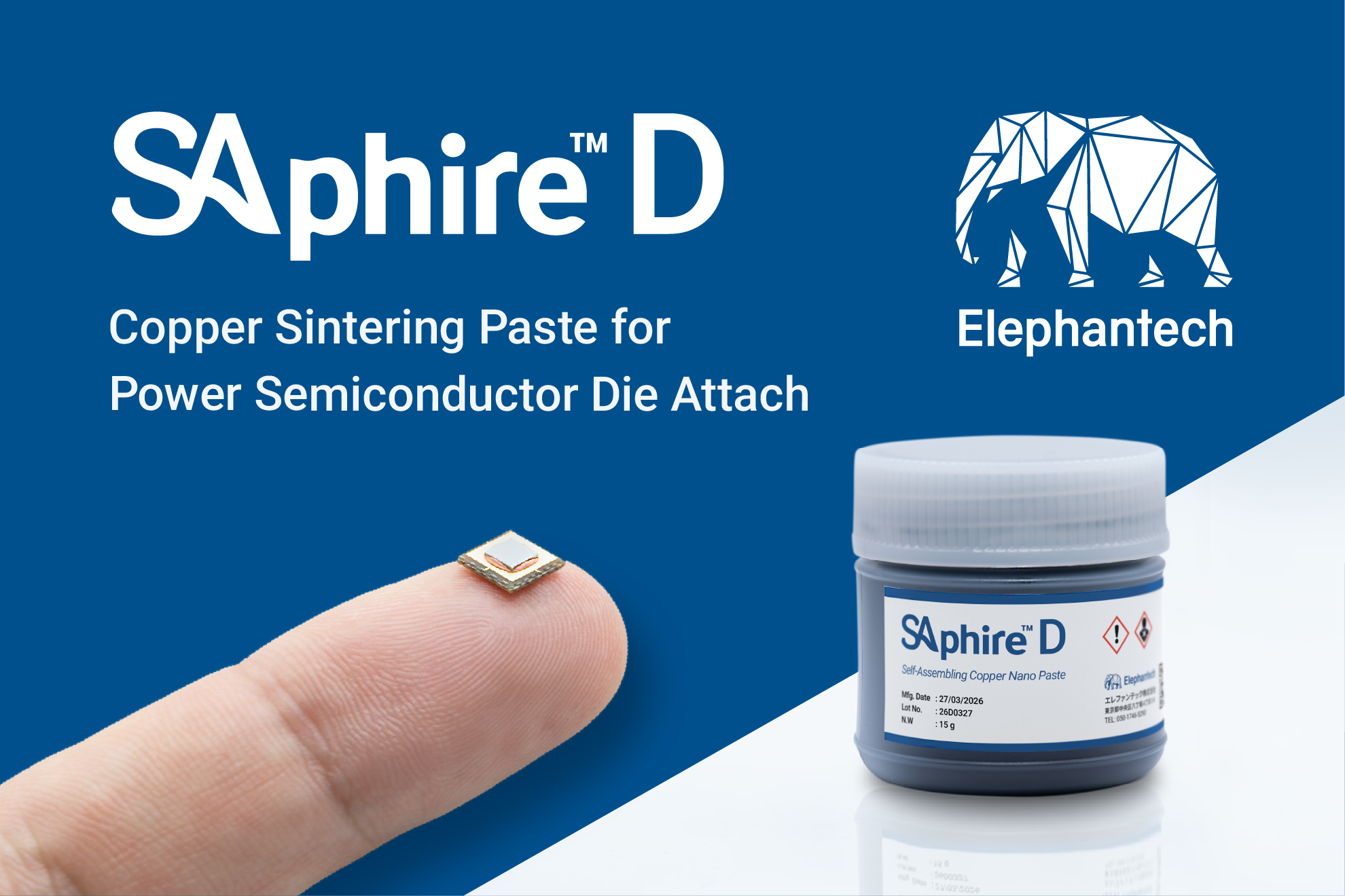 Elephantech Inc. today announced the successful development of SAphire™ D, a low-temperature sintering copper nanopaste, based on its proprietary Self-Assembling Copper Nanoparticles (SA-CuNP) technology. The new paste is designed for next-generation power semiconductor die attach process.
