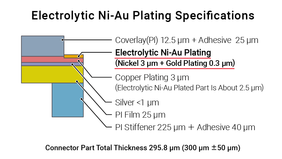 This is expected to improve the abrasion resistance of the gold plating layer when connectors are inserted and removed, and improve corrosion resistance by reducing exposure of the underlying nickel layer and copper foil.