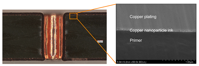 The newly developed primer and copper nanoparticle ink for FR-4 demonstrates strong adhesion. Notably, they exhibit high heat resistance, which was previously difficult to achieve. After a 240-hour test at 150°C, they maintain an adhesion strength of over 1.0N/mm*, reaching a level suitable for use in rigid circuit boards.