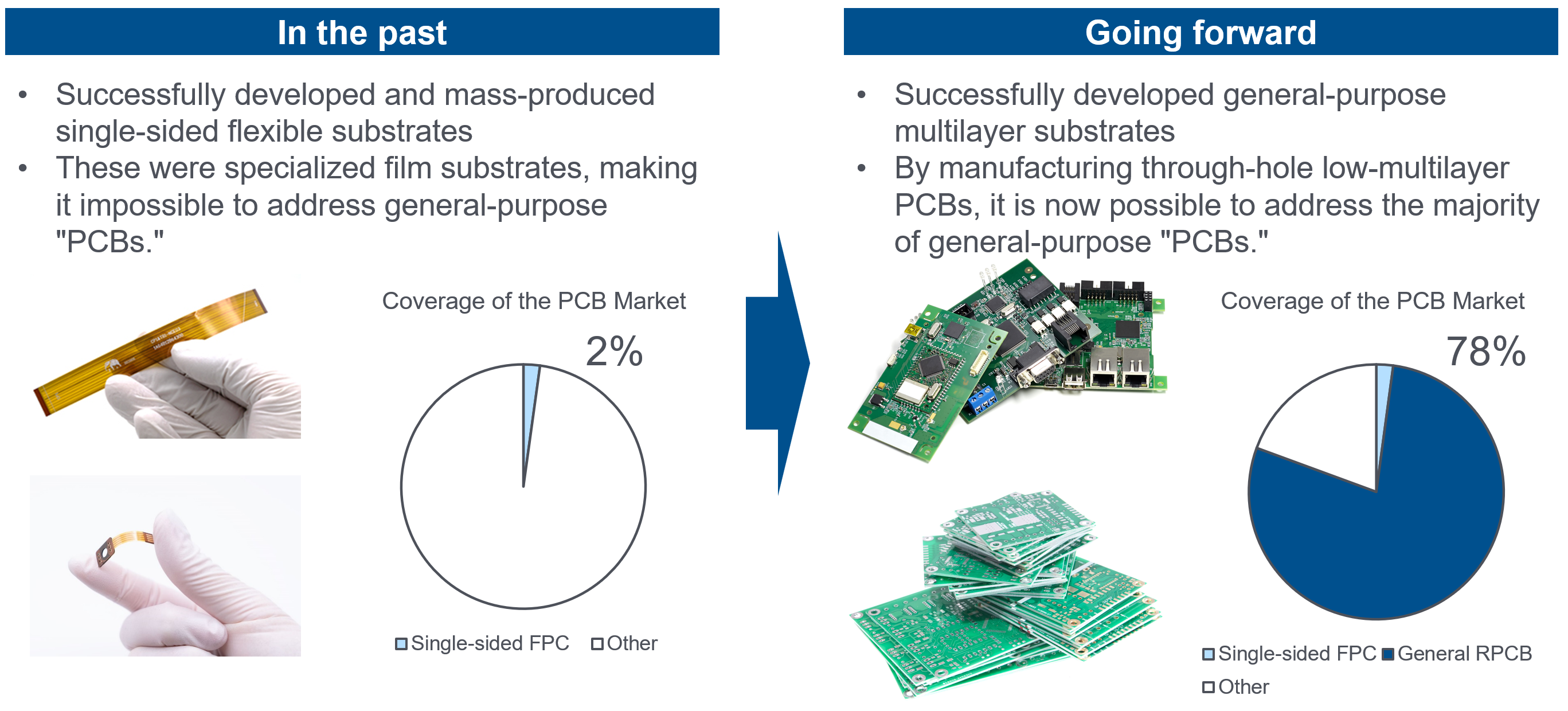 In the global PCB market, we have expanded from being able to address only about 2% of products on an area basis to now being capable of addressing 78%. While the market size for single-sided FPCs was around 10 million square meters, rigid boards with 6 layers or fewer account for 370 million square meters. Most electronic devices use rigid boards with 6 layers or fewer, and with this development, we can now replace almost all boards except for specialized ones.