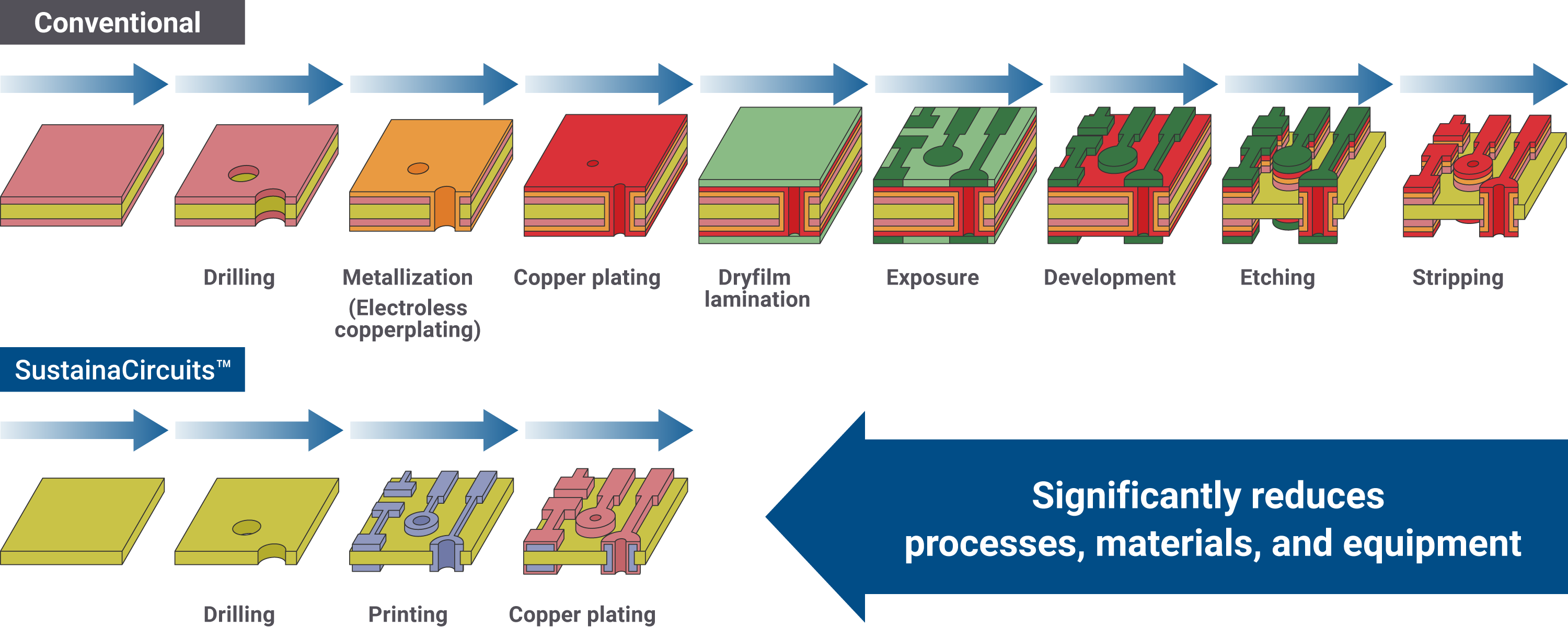 The process reduction impact is even greater for multilayer PCBs than for single-sided PCBs, as our new method can form vias and wiring simultaneously.