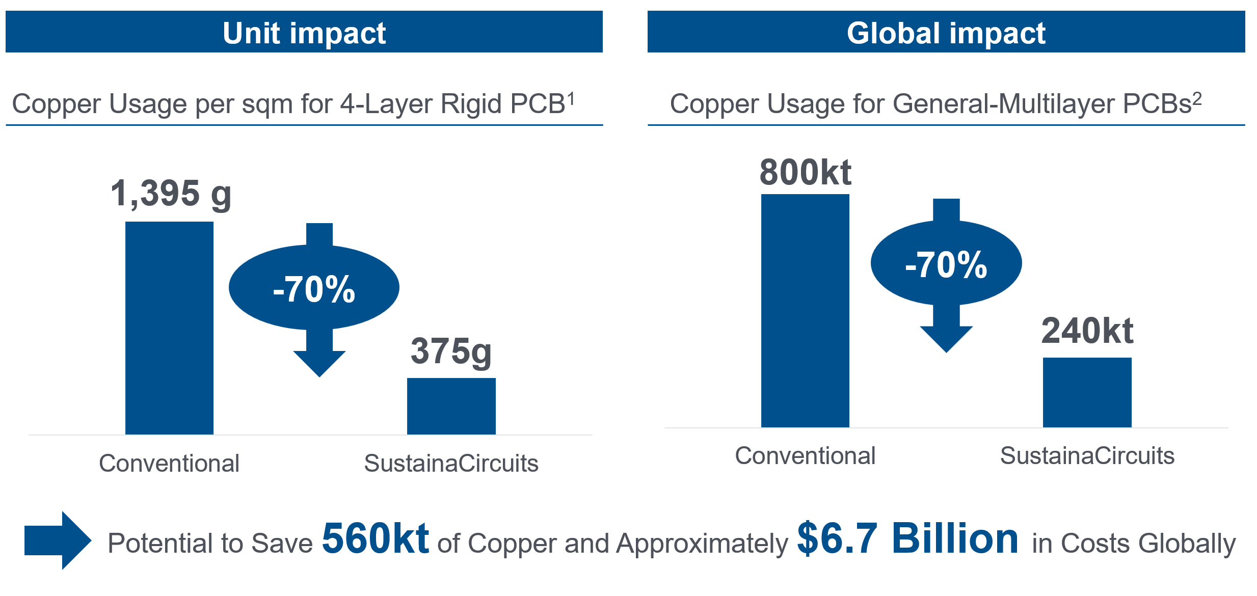 This technology not only significantly reduces environmental impacts, including CO2 emissions, but also has the potential to reduce PCB manufacturing costs by over 1 trillion yen annually, primarily by reducing copper usage in general-purpose multilayer PCBs by 70%3, which constitutes a large portion of their cost structure.