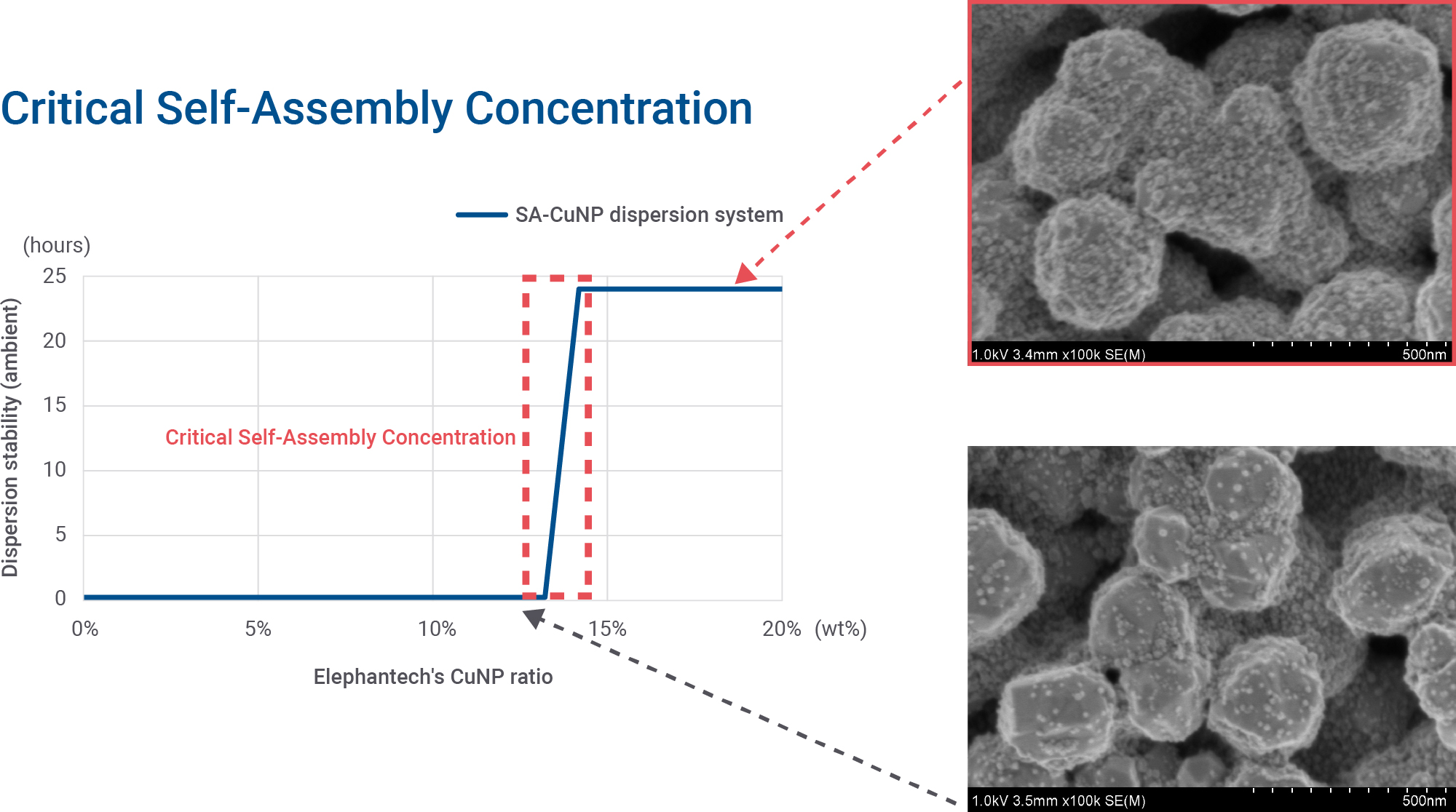 SA-CuNP also exhibits a unique behavior: once its concentration exceeds a certain level, self-assembly is rapidly triggered. Elephantech defines the threshold as Critical Self-Assembly Concentration (CSAC), a concept similar to Critical Micelle Concentration (CMC). Above CSAC, dispersion stability increases dramatically, enabling higher-performance paste formulations.