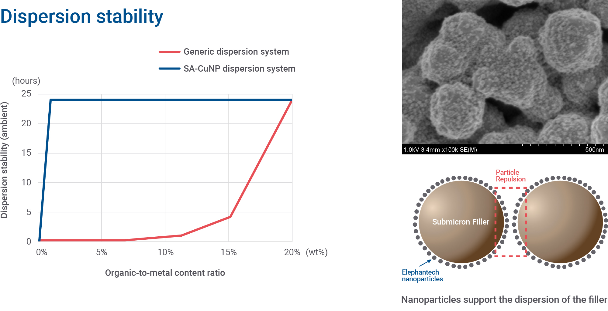 Elephantech’s SA-CuNP technology overcomes the limitations by enabling copper-to-copper dispersion without depending on organic dispersants.