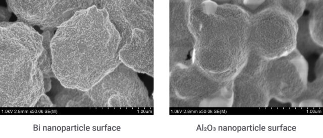 SEM image capturing the self-assembly behavior of SA-CuNP for various inorganic microparticlesFurthermore, SA-CuNP’s similar self-assembling behavior on Bi and Al2O3 particle surface has been confirmed, suggesting future applications in controlled dispersion of resin composite materials and improved flowability of high-filler loaded materials.