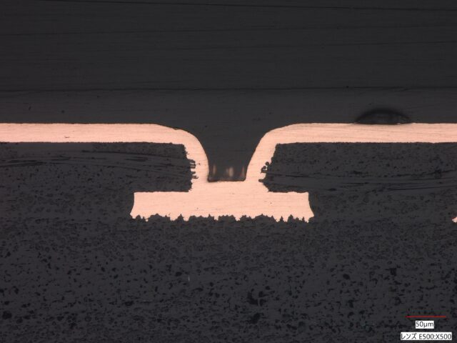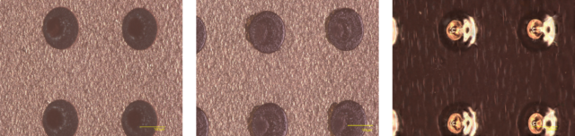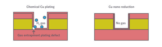 (from left) after drilling – after inkjet printing – after electroplating (MSAP・conformal)With this process, the reducing solution serves as an alternative to chemical plating, enabling a significantly simplified flow while offering enhanced process stability and greater design flexibility. By employing a reducing solution that does not generate hydrogen, it eliminates outgas from the underlayer. As a result, the risk of gas-induced voids is fundamentally eradicated to achieve palladium-free and formaldehyde-free engineering.