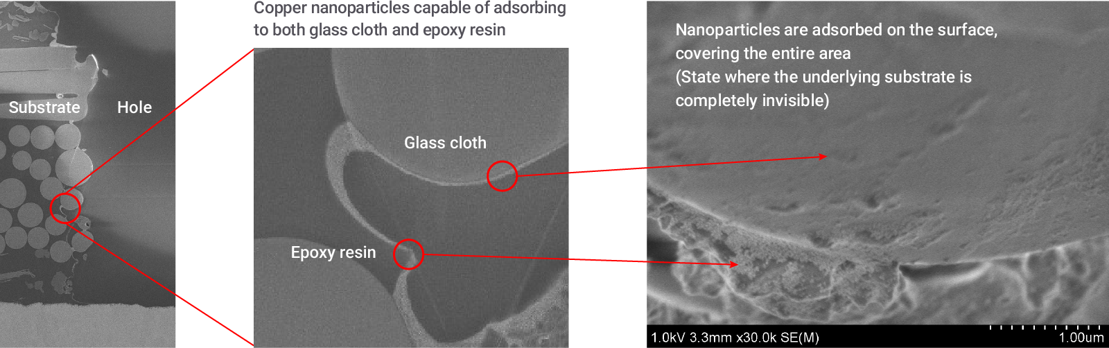 The mechanism of the process is that copper nanoparticle ink penetrates deeply into the micro-scale surface irregularities of the via sidewalls and adheres firmly to them. Owing to their miniaturized particle size of 15 nm, the nanoparticles carry high surface energy. The force that reduces surface energy by driving the nanoparticles onto the via walls, and the force that pulls nanoparticles toward each other maintain a well balance, sustaining a state where the nanoparticles adsorb to the via walls without aggregation. Such behavior is realized on both glass and epoxy substrates.