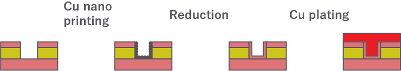 Comparison of Cu nano reduction VS electroless platingBy replacing electroless plating with “copper nanoparticle ink coating + reduction” solution, the technology is applicable to a wide range of manufacturing methods across SAP, MSAP, subtractive and full additive. Additionally, the ink, as an inkjet-printable material, supports both selective and full-surface deposition.
