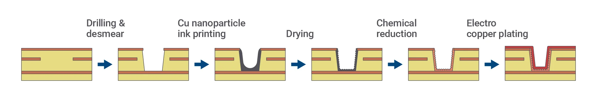 DeepVia™ HDI introduces a fundamentally different seed layer formation approach. Following drilling, copper nanoparticle ink is applied into the vias using inkjet printing. The ink, optimized for high AR via metallization, spontaneously spreads and wets the via surfaces, enabling uniform coating of the inner walls. In the subsequent reduction step, the deposited copper nanoparticles coalesce to form a continuous copper layer.