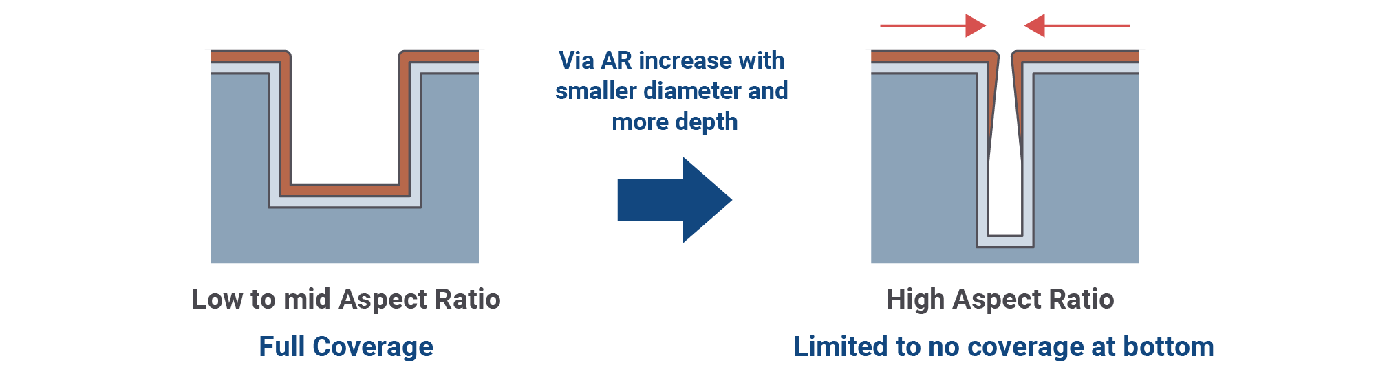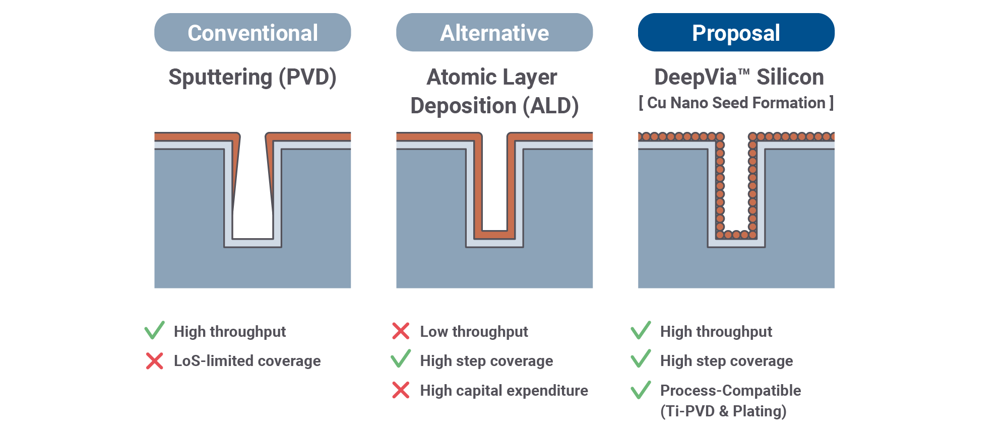 DeepVia™ Silicon not only serves as a complete replacement for the conventional PVD approach, but can also complement PVD as part of a hybrid solution to improve coverage.