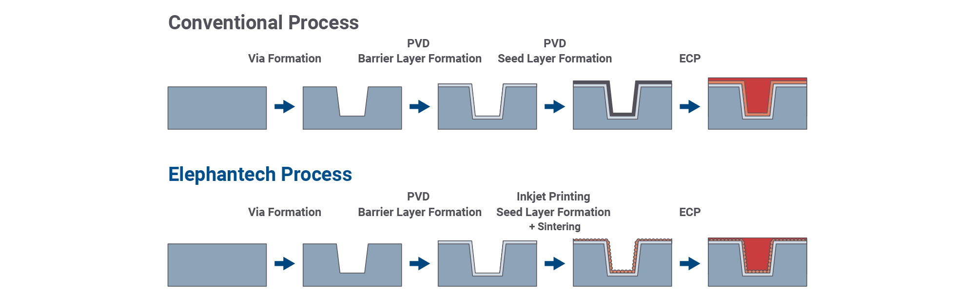 Elephantech has developed a novel process for forming copper seed layers on the inner walls of high AR vias, combining proprietary 15 nm-class copper nanoparticles with inkjet printing equipment. Copper nanoparticle ink is dispensed into the vias by inkjet printing, where proprietary adsorption characteristics enable uniform coverage of copper nanoparticles across the entire inner via wall surface. Through drying and sintering, the nanoparticles coalesce to form a thin copper film, which serves as a seed layer for standard electrochemical copper plating (ECP) to complete the interconnection.