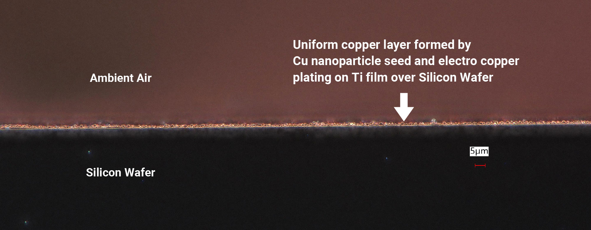 Cross-sectional SEM view of the uniform copper seed layer and electroplated layer over Ti barrier layer