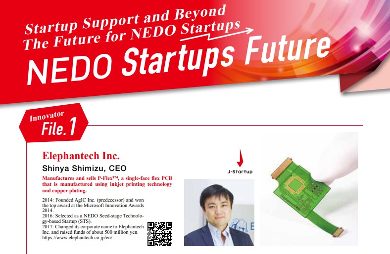 On “Focus NEDO No.73 Special Edition NEDO Startup Future” published by NEDO*, our company was featured as a startup company that manufatures and sells P-Flex🄬, a single sided flexible PCB manufactured with the use of inkjet printing and copper plating. *NEDO: National Research and Development Agency New Energy and Industrial Technology Development Organization Media Coverage List of Media Articles