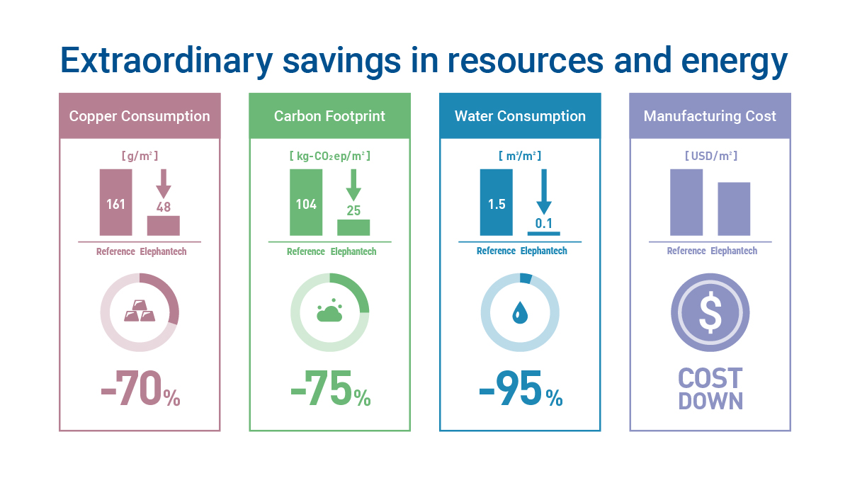Elephantech Inc. is pleased to announce that the company has published an estimate on LCA-based reductions in 1) CO2 emission, 2) water consumption, and 3) toxic substances when using the company’s Pure Additive™ processing as compared to conventional PCB manufacturing methods.