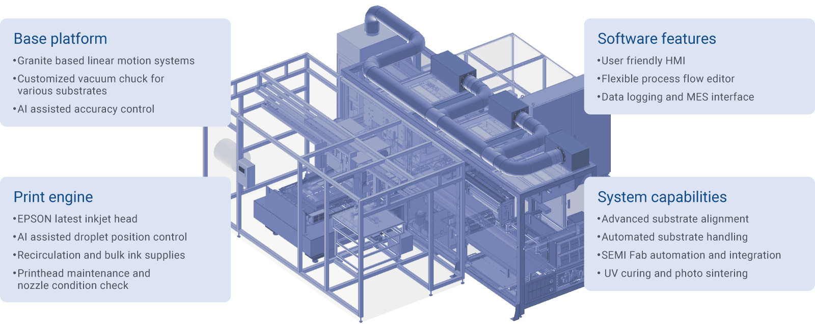 It features a high-precision stage control function for exceptional impact repeatability and a droplet position control system utilizing NeuralJet™, enabling highly precise mass production processes.