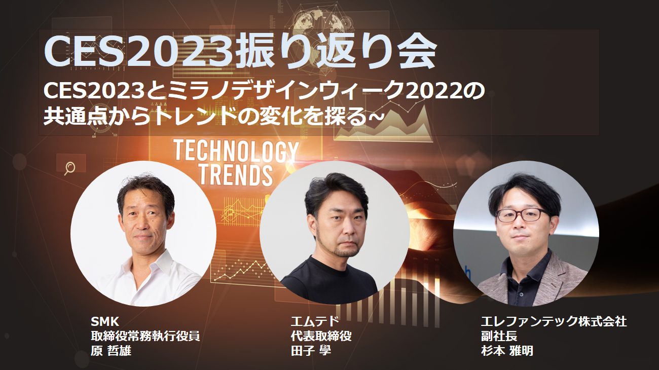 2年ぶりのフル開催となり活気を取り戻したCES2023では、EVやVR、と言ったトレンド以外にもグリーンイノベーションを中心にいくつかトレンドがありました。加えて、CES2023の参加者の中には、前回のミラノデザインウィークとの共通点が見られるとの指摘があることに注目しました。 今回の企画のきっかけとなった会話をしたCESに長年出展し続けているSMK株式会社 原 哲雄と、ミラノデザインウィークに多く参加・展示も複数回経験があり、今年始めてCESに参加したエレファンテック株式会社 杉本 雅明に加えて、ミラノデザインウィークに長年参加、多数の展示を手掛けたことのあるMTDO inc. 田子 學氏をお呼びして、CES2023を振り返りながらミラノデザインウィーク2022で見られた展示やトレンドと比較し、2023年を占うようなクロストークをお届けします。 日比谷から世界へ。BASE Qはイノベーションや新たなムーブメント創出の基点となる交流を目的としたコミュニティです。今回のイベントはBASE Q の協力でお送りします。 開催概要 日時 2023年2月6日 18:00~20:00、17:30開...