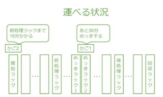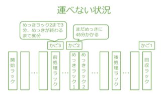 - かご1が後処理ラックにある状態でかご2のめっきが終了してしまい、かご2がめっきを出て後処理ラックまで移動したいのにかご1が占領しているという状況になってしまう。