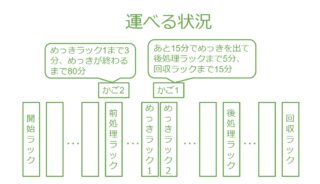 なので開始ラックに置かれたかごをどんどんめっきしていくためのタイムスケジュールを自動で組み立てなくてはいけません。