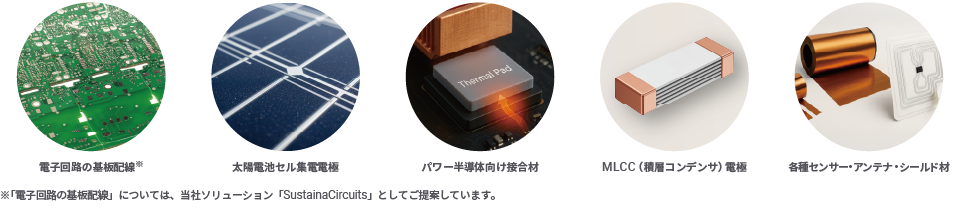 これらの仕様に裏付けられた銅ナノフィラーは、高い導電性、低い抵抗率、そして優れた熱伝導性といった特長を備えています。インクからペーストまで様々な形態での供給が可能で、以下のような幅広い用途での活用が期待されます。