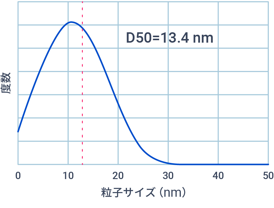 粒度分布測定結果長年の研究開発を経て、エレファンテックは独自技術を用いて新たな銅ナノフィラーを合成しました。本製品は、平均径15nmの超微細かつ均一な銅粒子で構成されており、6ヶ月以上にわたる優れた分散安定性を実現しています。さらに高い保存安定性に加え、60℃という低温での湿式還元を可能にすることで 、製造工程の簡素化にも大きく貢献します。