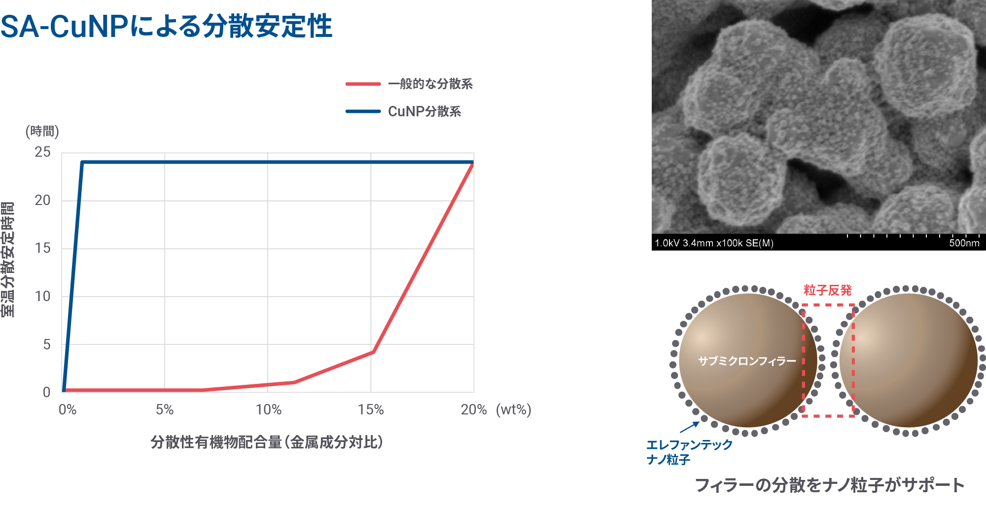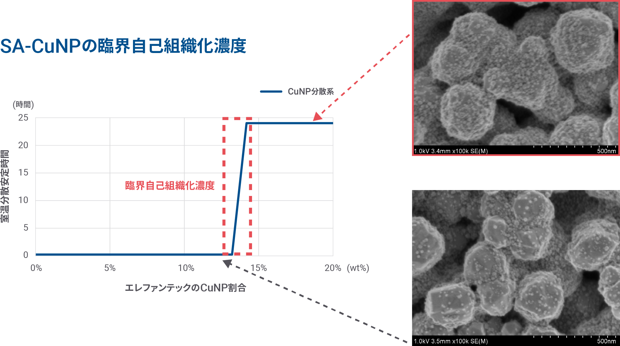 SA-CuNPが無機粒子に自己組織化する現象を捉えた走査電子顕微鏡(SEM)像エレファンテックは、今後も新たなナノ材料の可能性を切り拓いてまいります。