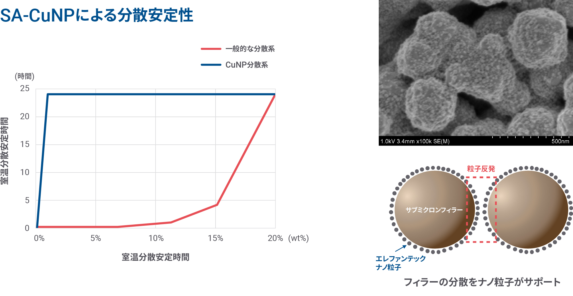 しかし、従来のCuペーストでは、有機分散剤によって微粒子を安定化する必要があり、有機分散剤を増やすことによる金属含有量の低下・焼結阻害・導電率低下などが実用上の課題となっていました。