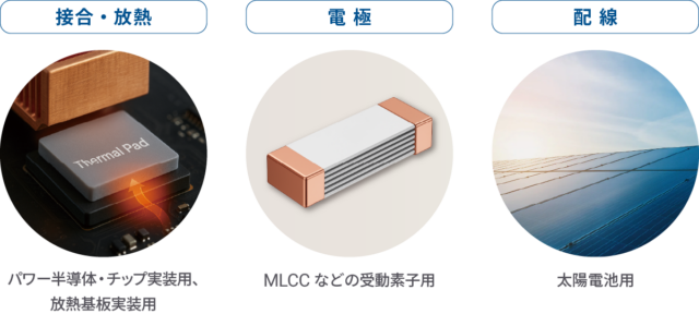 本技術により、パワー半導体の接合材・放熱材、受動素子の電極材、配線(太陽電池など)への応用が期待されます。