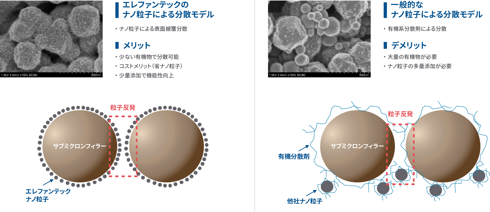 SA-CuNPが無機粒子に自己組織化する現象を捉えた走査電子顕微鏡(SEM)像エレファンテックは、今後も新たなナノ材料の可能性を切り拓いてまいります。