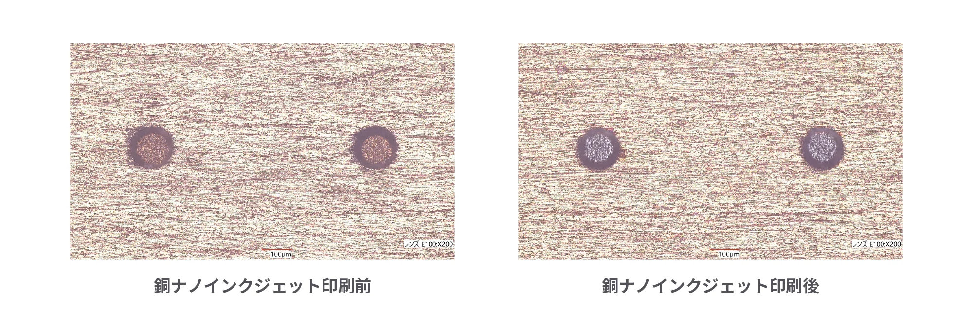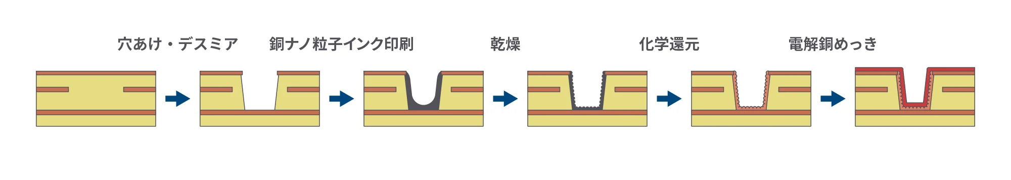 今回開発したDeepVia™ HDIでは、銅ナノ粒子インクを印刷して還元するという、化学銅めっきとは根本的に異なる方法でシード層を形成します。ビア穴あけ後、銅ナノ粒子インクをビアにインクジェット印刷装置で印刷します。この銅ナノ粒子インクは高AR用ビア導電化用に開発されたインクで、印刷されたインクがビア内に自発的に濡れ広がっていくことで、ビア内壁を銅ナノ粒子で覆い尽くします。次に、還元液に浸漬することで、銅ナノ粒子同士が結合し、銅膜を形成します。