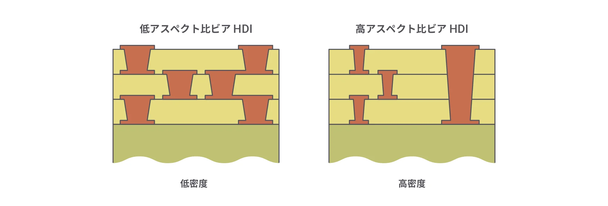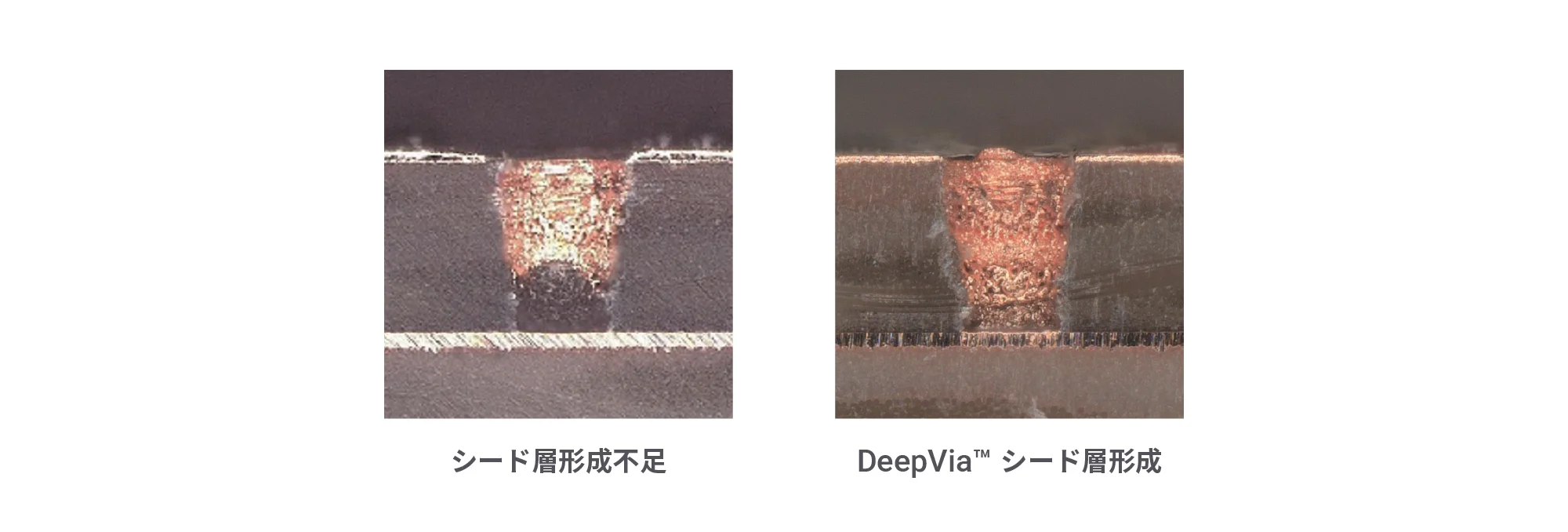 その中で重要性が高まっているのが、高アスペクト比ビア(細く深い接続穴)です。より深い層まで効率よく接続できれば、基板設計の自由度が高まり、AIサーバの高性能化に貢献します。一方で、従来工法ではこうしたビアの導電化が難しく、量産上の課題となっていました。DeepVia™ HDI は、この課題を解決し、次世代AI基板の実現を支える新しいソリューションです。
