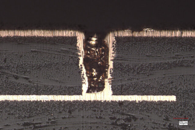 DeepVia™ HDIを用いて、既にAR3.0以上の超高アスペクト比のBVHの試作に成功しております。既存の化学銅めっきではAR1.0以下が推奨されており、実力値としてもAR1.2程度とされているのに比べ、飛躍的な高アスペクト化が可能になります。