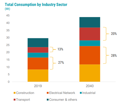 では世界で最大の銅資源を保有するチリの状況を簡単に見てみたいと思います。チリ資源公社Codelcoのプレゼンテーションでは、既存の鉱山での生産量はこの先10年で74%減と見込まれています。世界最大の資源国といえども資源の枯渇が顕著ですね。Codelco社はこの先10年で約4兆円!!の投資を検討していますが、それでも生産量は漸減。一方でEV化が急速に進められる中で今以上の銅消費量が見込まれています。