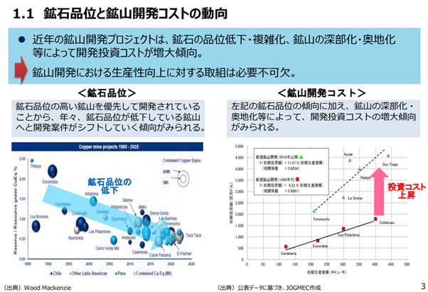 NEDO/日立総合研究所が纏めた資料を見てもその傾向は明らかで、鉱石品位が年々低下しており優良鉱山が減って来ているのがわかると思います。質の悪い(=鉱石品位が低い、辺鄙な場所など)鉱山を開発することは、それだけ投資コスト・採掘コストが上昇するのも理解できます。