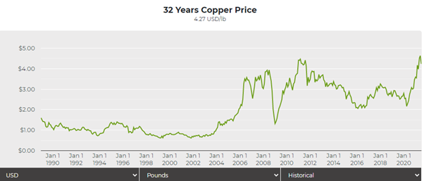 その上昇した投資・生産コストは一体誰が払うのかというと、当然消費者なわけですよね。銅価格はこの30年間で約4倍になっていることが下図からもわかると思います。