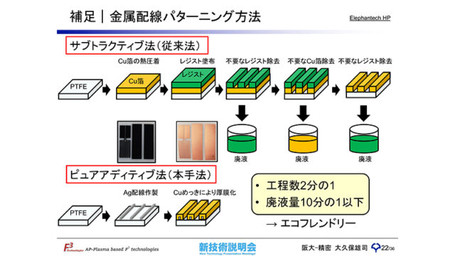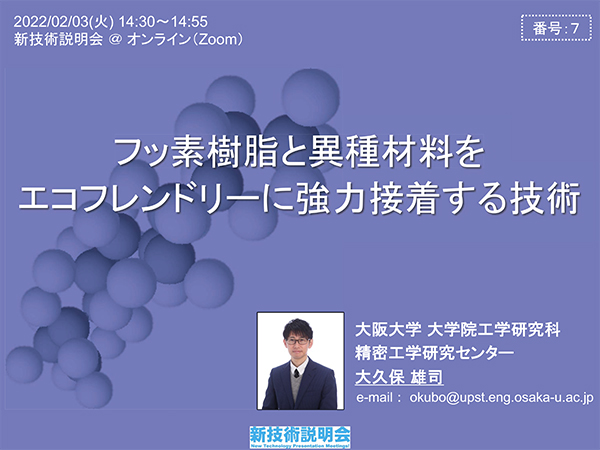 2022年2月3日オンラインで開催された大阪大学新技術説明会において、大久保雄司先生の「フッ素樹脂と異種材料をエコフレンドリーに強力接着する技術」発表の中で、弊社の「ピュアアディティブ法によるFPC製造」について触れていただきました。弊社の技術をご紹介いただきありがとうございました!