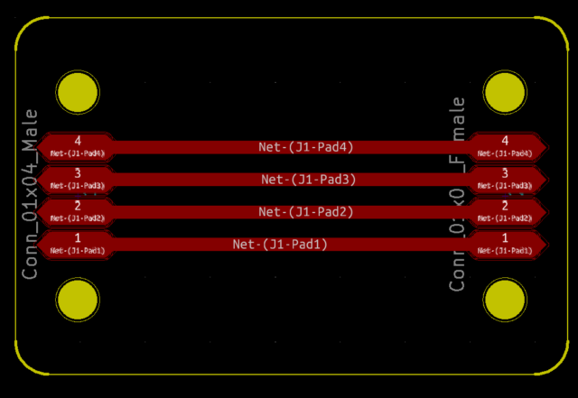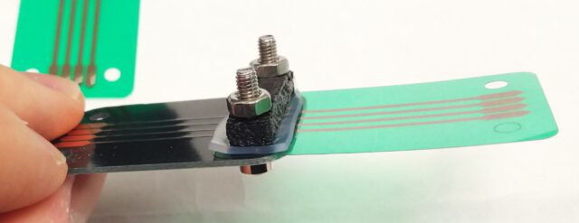 幅1mmの配線をデカいパッドに接続。この形のパッドを持つ基板を2枚用意して、穴を通してネジで締めて押さえつけることで接続できるという寸法なのです。