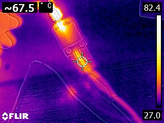 サーモグラフィ画像の左上で煌々と輝く抵抗塊。こいつの熱が配線を通して抵抗とリジッド基板の接続部に伝わり、融かしてしまったようです。