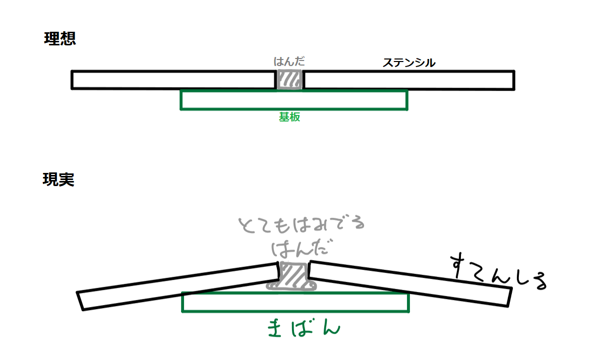 どうしてこんなことになってしまったかというと、基板にステンシルを載せたとき、下の図(かなり大げさに書いた図)のようにステンシルが曲がって浮いてしまうのです。僕の腕が悪いだけかもしれませんが