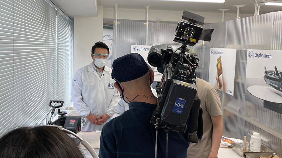 6月8日22時、テレビ東京 WBS トレンドたまごのコーナーで、エレファンテックと日華化学が共同開発をしたネオクロマト加工について放送されました。 当日の番組の予告編 #中垣正太郎 です。もうすぐ夏!Tシャツを着る機会も増えますね!ただ、デザインにちょっと飽きてしまったなぁというときもあると思います。そんな時、今日の #トレたま を使うと、Tシャツが生まれ変わる?!詳しくは今夜22時から放送の #wbs でお伝えします! pic.twitter.com/B8GYKf3W1W — WBS@テレビ東京 夜10時から放送中(金曜のみ夜11時) (@wbs_tvtokyo) June 8, 2022 当日の弊社での撮影の様子