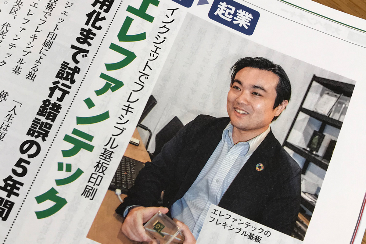 新しいものづくりがわかるメディアfabcross に取り上げて頂きました。記事の中の写真や説明もわかりやすいです。 エレファンテックが次に狙うのはP-Flexによる基板の製造や販売ではなく、P-Flexの製造ラインごと販売することだ。最終的にはP-Flexによるフレキシブル基板の製造ラインをあらゆる業界に導入させることを目指している。 「自分たちがやりたいのは基板を売ることではなく、新しいものづくりのプロセスを広めること」と語る杉本氏は、3DプリンターによるAMの流れの中に自分たちの技術はあると強調する。 「金型がいらないから初期投資が安く抑えられて、少量でも大量生産でもコストは変わらない。既存の製造方法と比較して製造プロセスも短いし、試作と量産で同じ機械を使うのでアイデアから形になるまでも早い。既存の製造方法ではできないような複数の機能がある部品も製造できる——全てにおいて、AM(アディティブマニュファクチュアリング)と全く同じメリットがある」(掲載記事より引用) メディア掲載一覧 ▶ fabcross 掲載一覧 ▶ メディア記事に掲載された記事を読む
