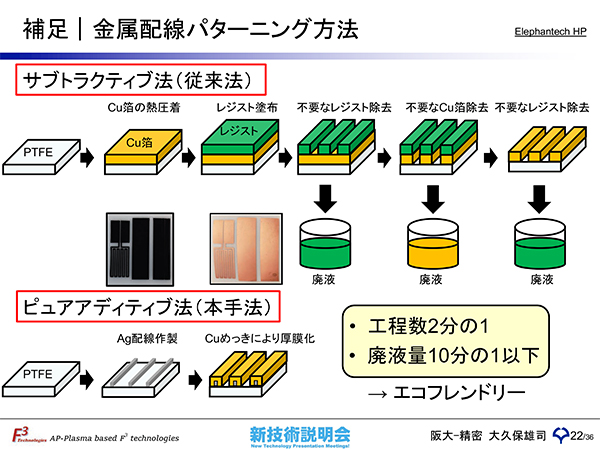 大阪大学大久保先生と協業で行っている「熱アシストプラズマによるPTFEの表面改質を活用した高周波向けPTFE基板の開発」について、6月25日に開催された日本接着学会で「インクジェットを利用した高周波対応フレキシブルプリント配線板 (Cu/ Ag/ PTFE) のエコフレンドリーな作製方法の開発」という題で学会発表をしました。 大久保先生が開発をすすめる熱アシストプラズマによるPTFEの表面処理は、従来のナトリウムを使う処理に比べて安全かつ廃液レスで異種素材等と密着するための処理が可能です。今回は、銅板を張り合わせてエッチングするプロセスに比べて、廃液が1/10以下になる当社のピュアアディティブプロセスを組み合わせることで、非常に環境負荷が低い製造手法でPTFEを基材とするフレキシブル基板の作成に成功しています。 日経 xTECHで取り上げられました。